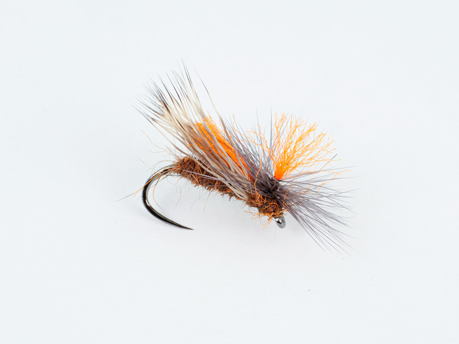"Designed during a World Championship in Sweden back in 2005 where very effective dry dropping fishing was needed to do well. The secret was not only the technique but also the very effective dry fly they used. It was a “bulky” deer hair parachute caddis with oversized hackle to help stabilize it in turbulent water. It changed into a long thin winged caddis with an upper wing built with the high vis fluorescent antron fibers. This bright Red (or orange) cape gave this pattern the name of Superman."