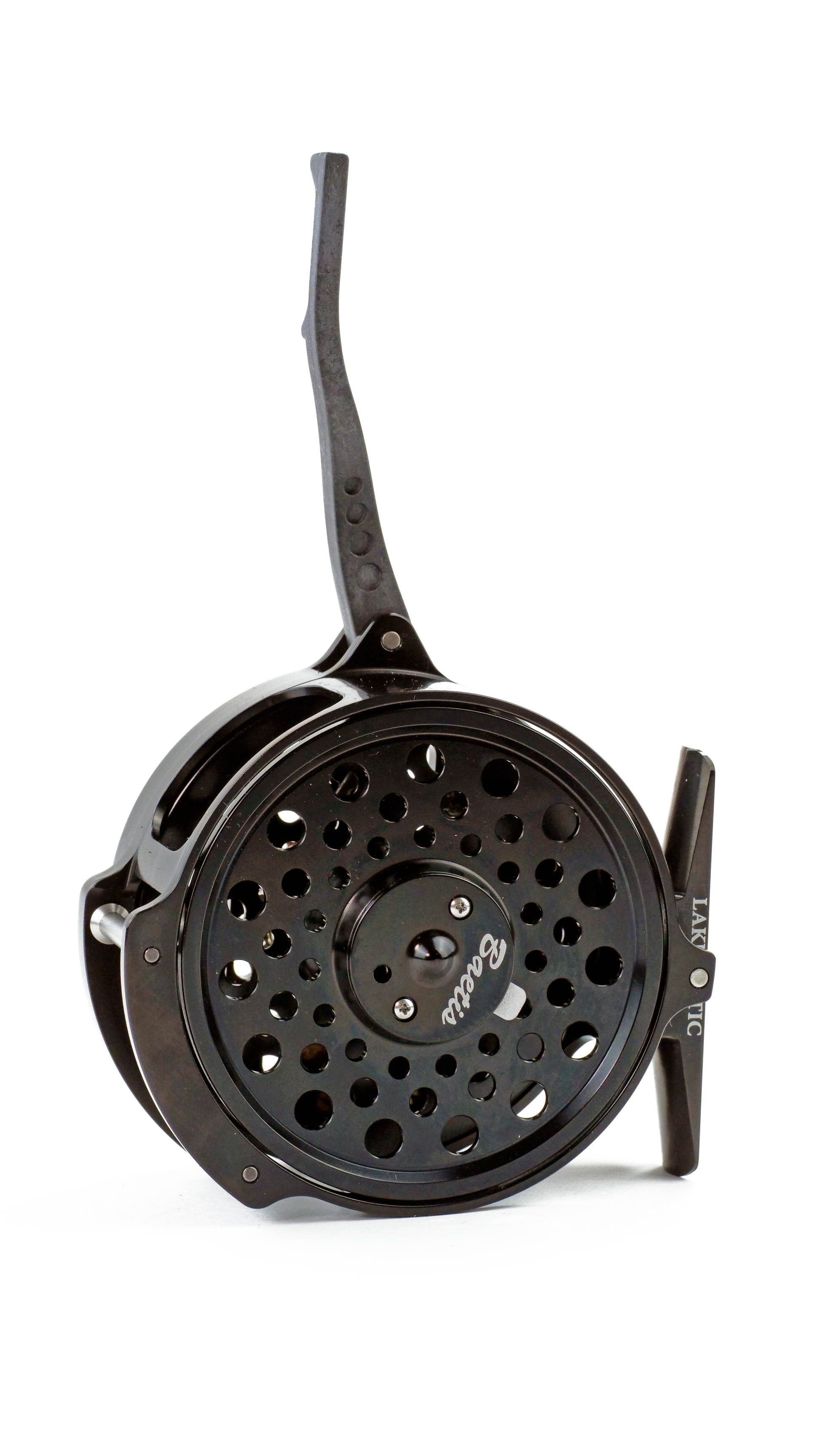 This Lakematic semi-automatic fly reel from Baetis features a machined aluminum body and a polycarbonate lever. It will quickly retrieve your line with a few flicks of the lever. The drag tension is adjusted by a small included Allen wrench which fits into a small hole on the face of the spool. I set the drag light and then add any extra tension with the palm on my free hand. This wider framed smaller arbor version is built to hold most lake lines up to 7 or 8 weight.