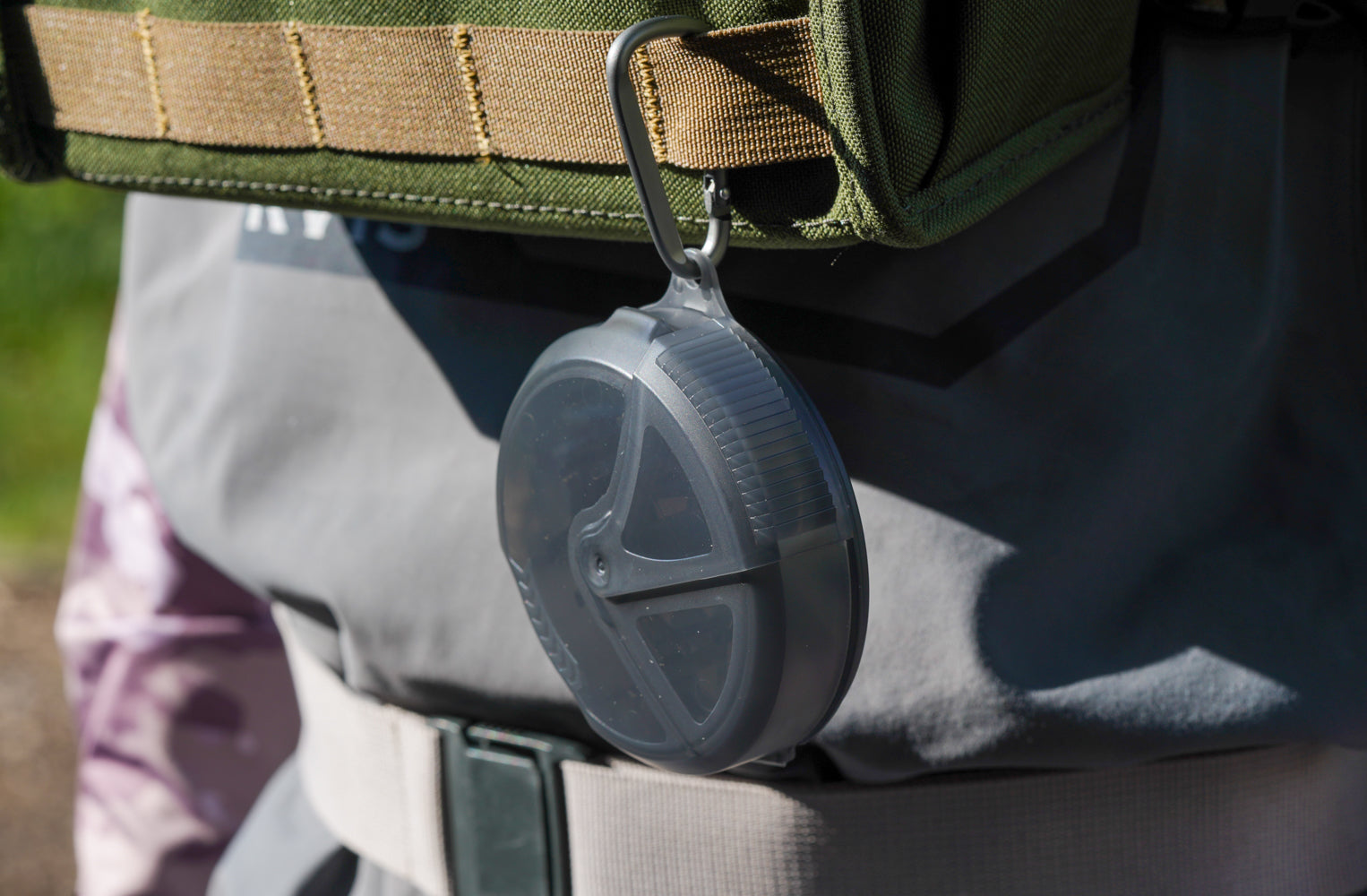Similar in function to the Mono-Master, this wheel shaped mono trap opens to reveal mono trapping teeth on a thumb-able wheel that will hold junk leaders and tippet till you're ready to open the trap and throw them in the trash. There's a sliding cover to close the trap when not in use. Fluoro doesn't decompose y'all!