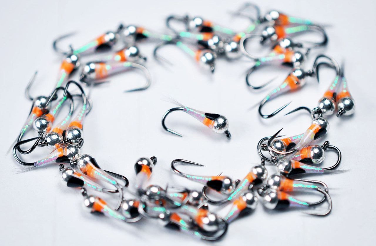 This particular color scheme of perdigon was one of the first to hit the U.S. scene years ago. Likely functioning on the same "something flashy" principle as the Rainbow Warrior or Lightning Bug, this pattern is ubiquitously effective. Great on gullible and picky fish alike. Tied by our friends Oscar Quevedo Iglesias of Spain.