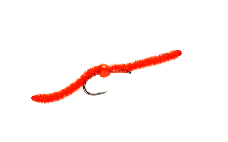 A tungsten bead San Juan Worm tied by Fulling Mill.
